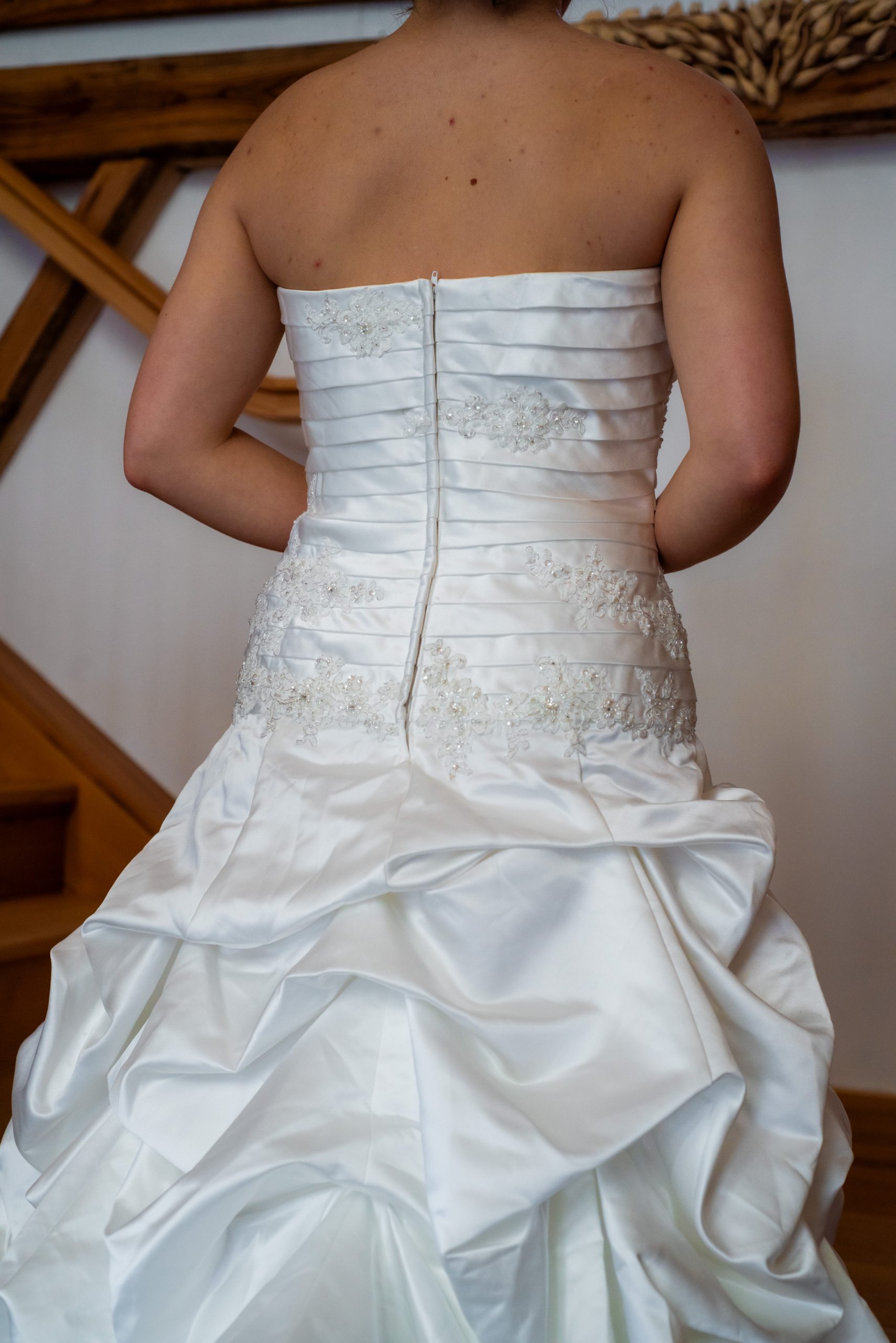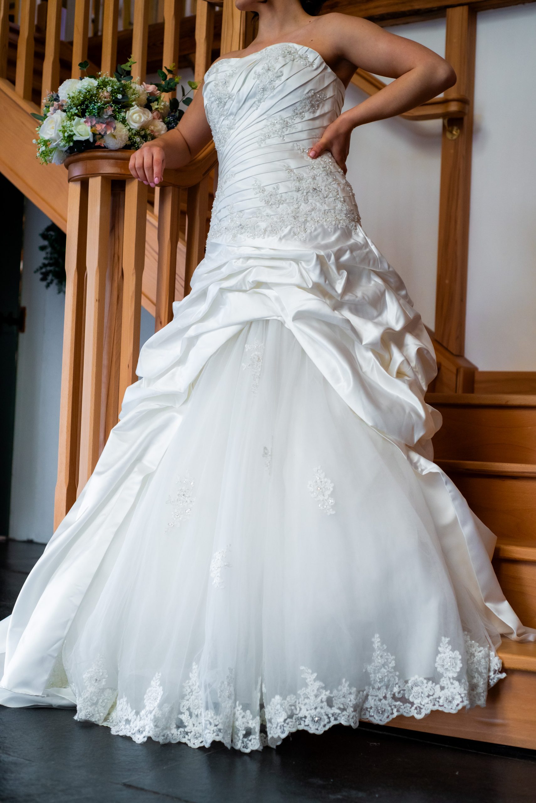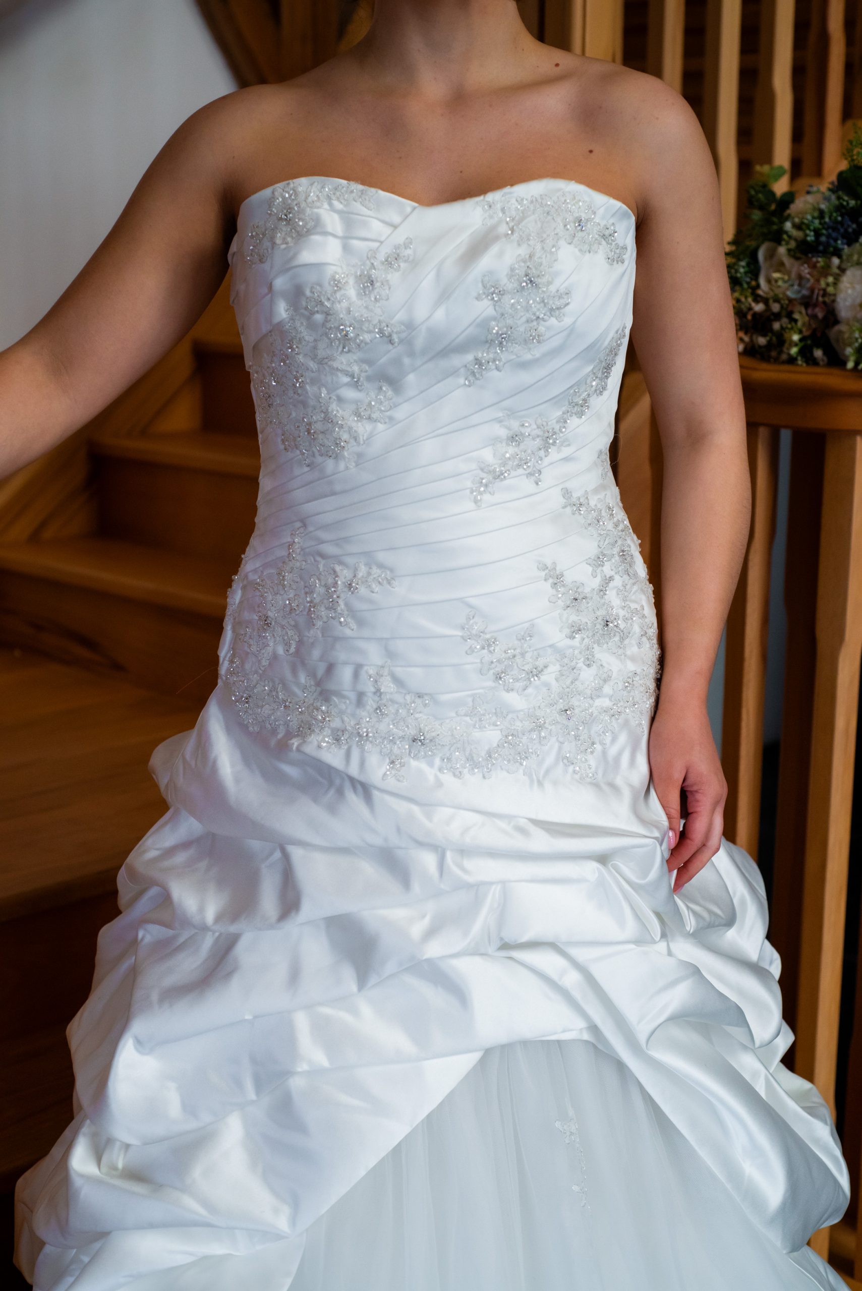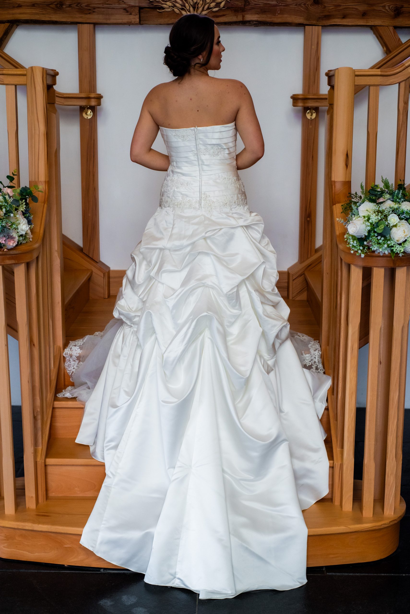 A sweetheart neckline with pleated satin bodice which is embellished with lace and beads down to the hip. The skirt has layers of ruched satin curtaining at the front to reveal layers of net and soft tulle, which is also embellished with lace, pearls, and beads, finishing at the hem with a scalloped lace. The back is closed via a zip and the ruched satin continues to give a stunning bustle effect which flows into a court tain. Measurements as a guideline are… Bust 94cm (37″), Waist 79cm (31″), Length at side seams 157cm (61.5″). Fabric is Polyester.