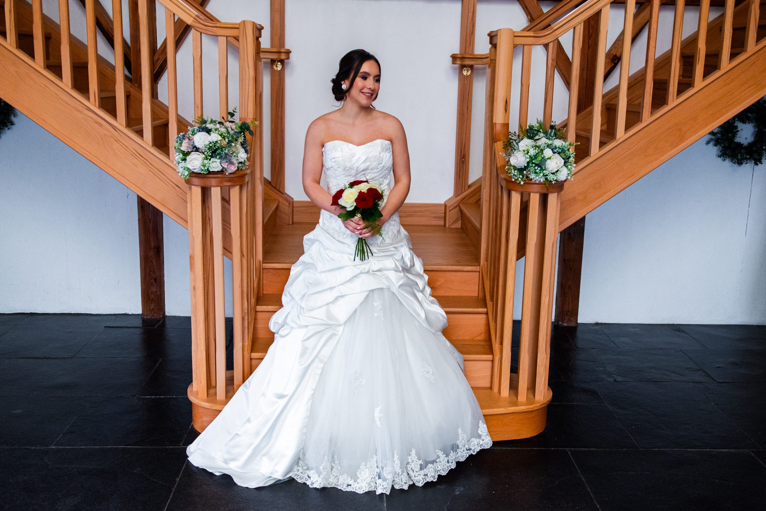 A ball gown dress with ruched skirt with under layers of embellished tulle, and pleated bodice gives this dress a romantic feel.