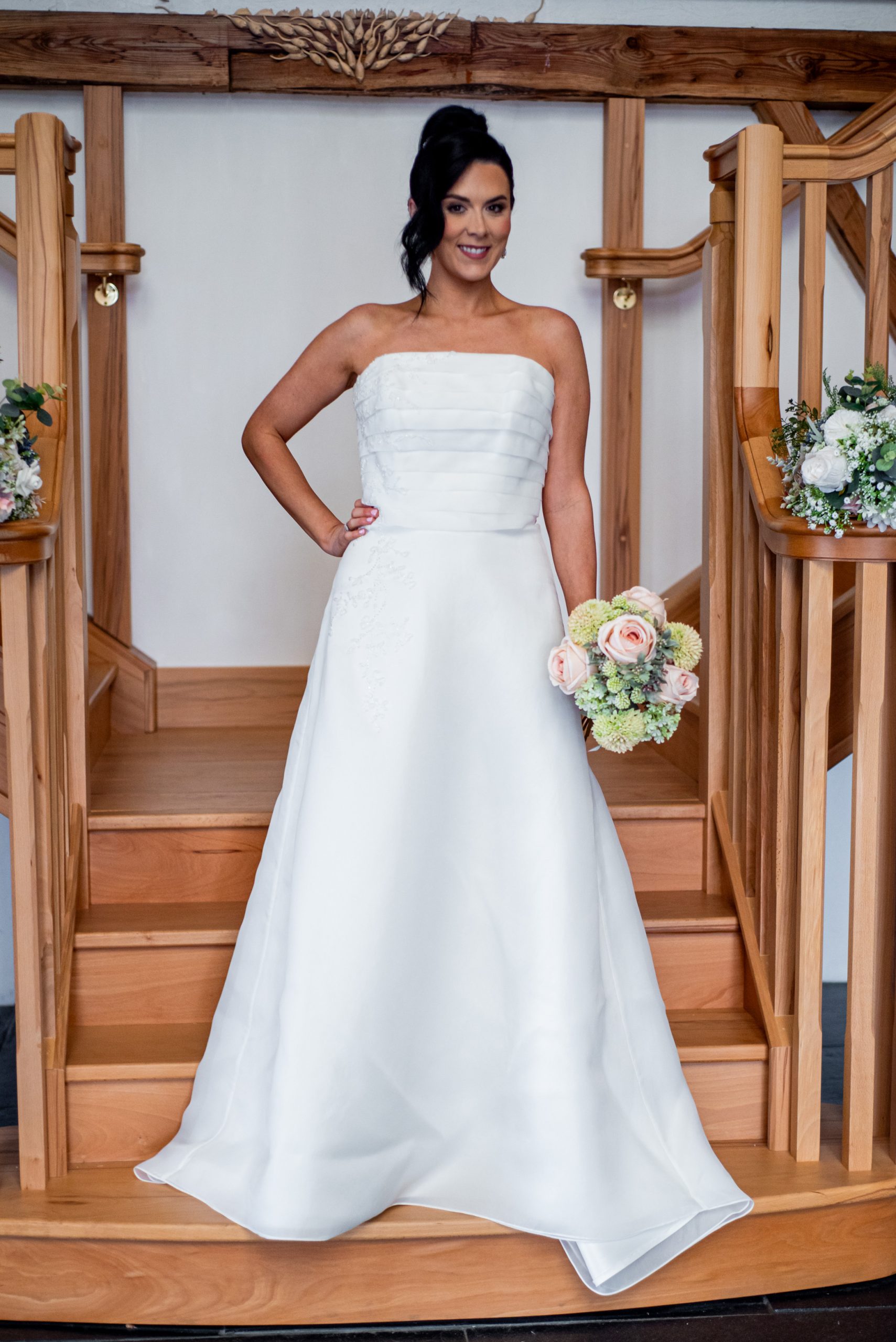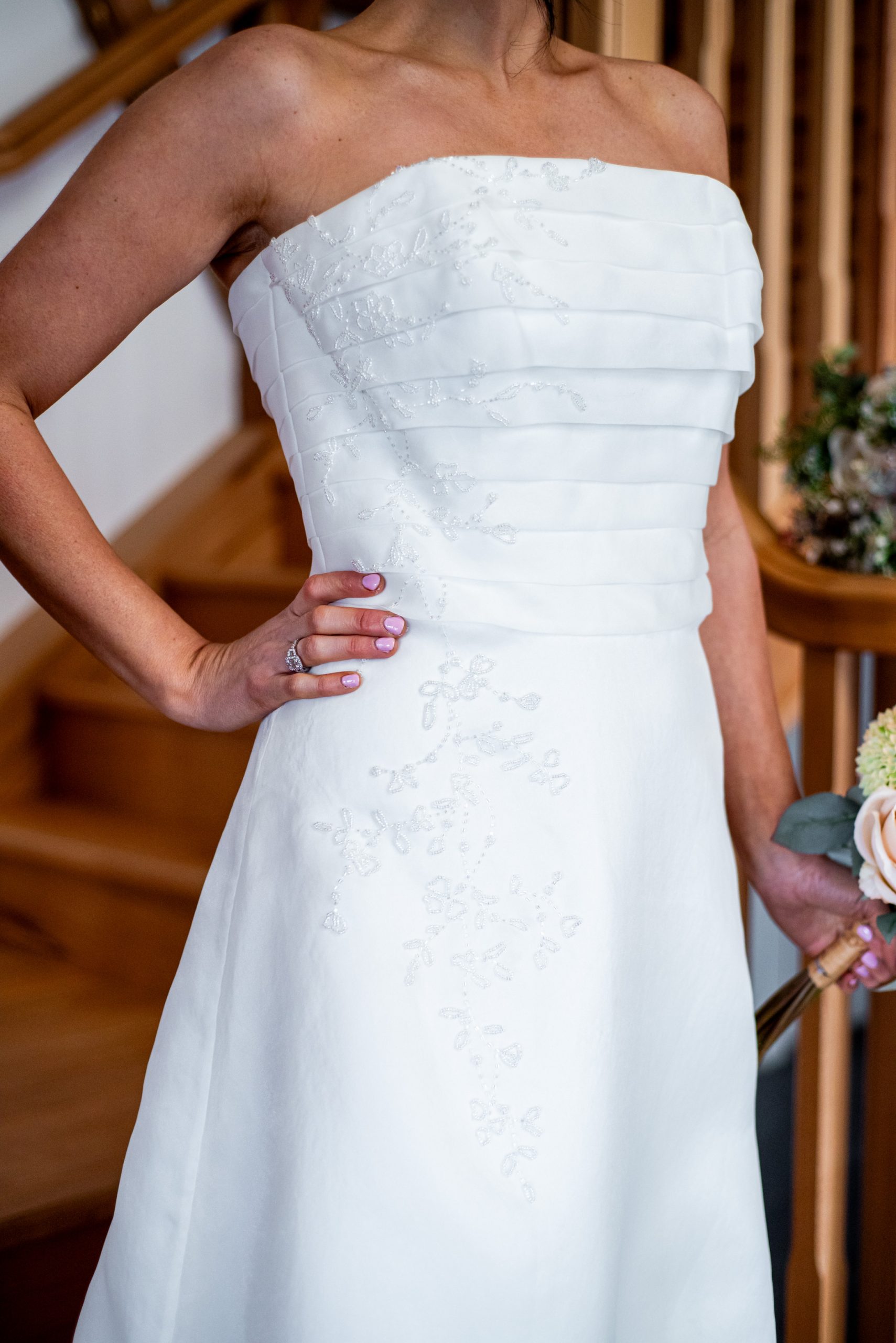 Floaty A line ivory dress, with pleated bodice and delicate beadwork.