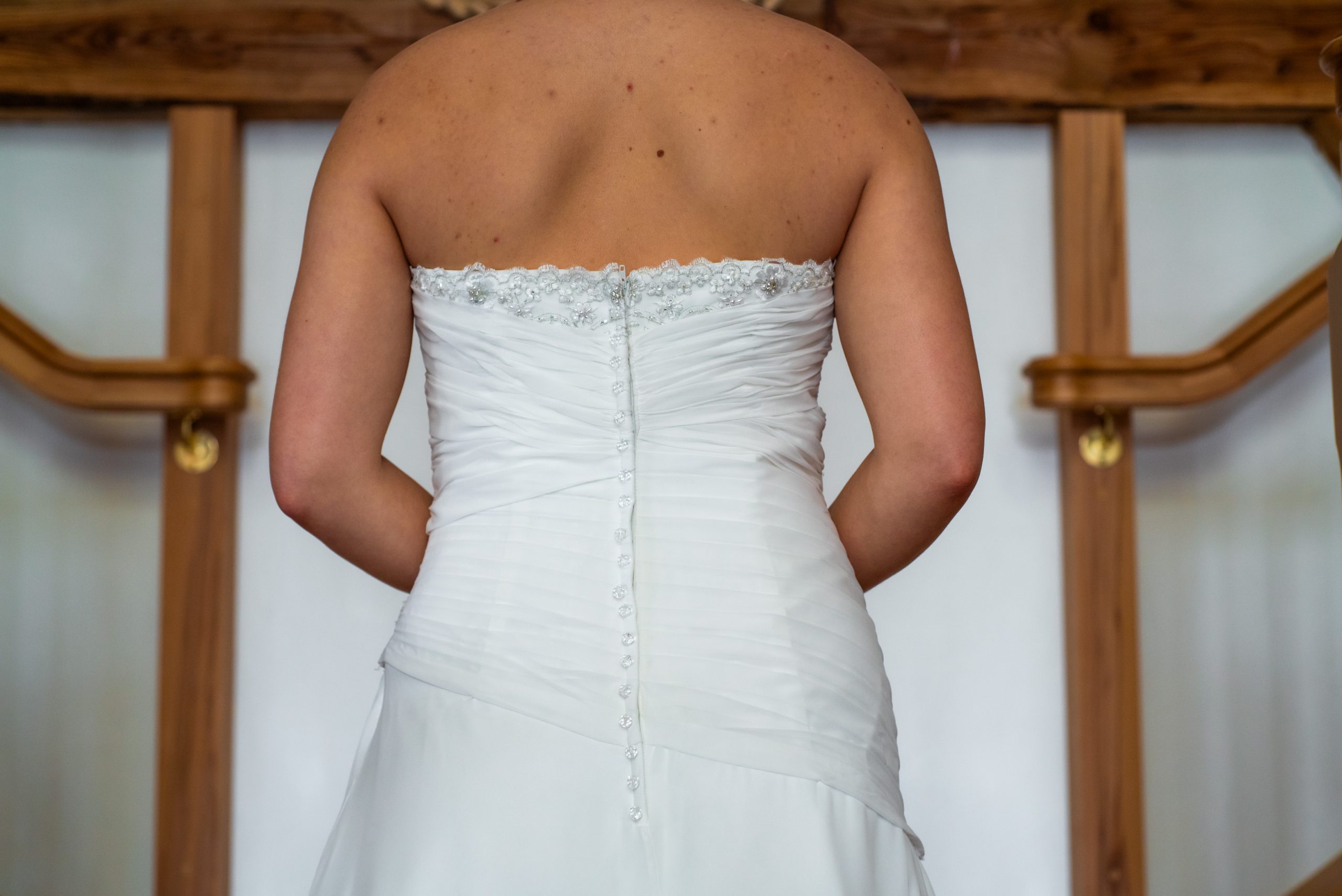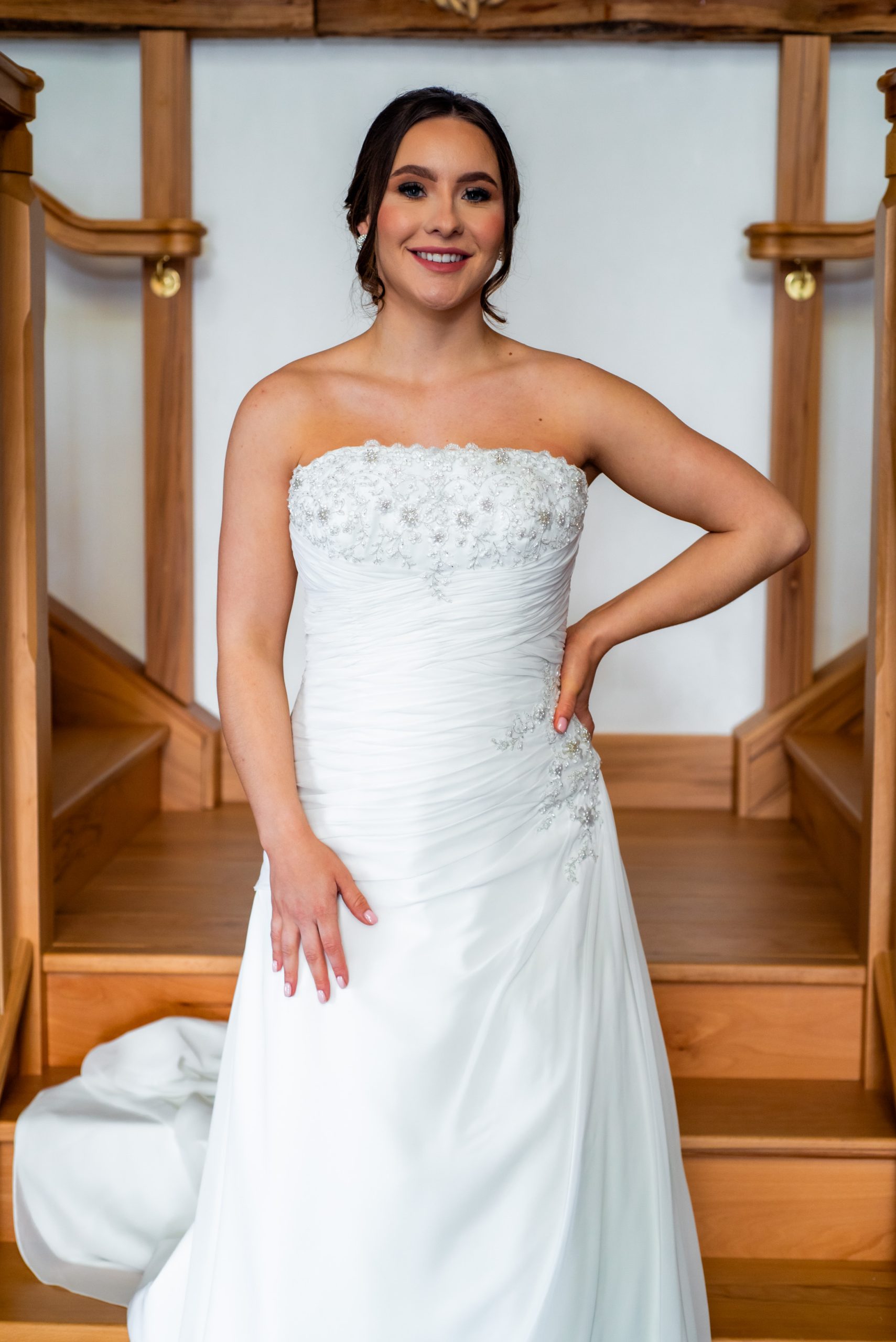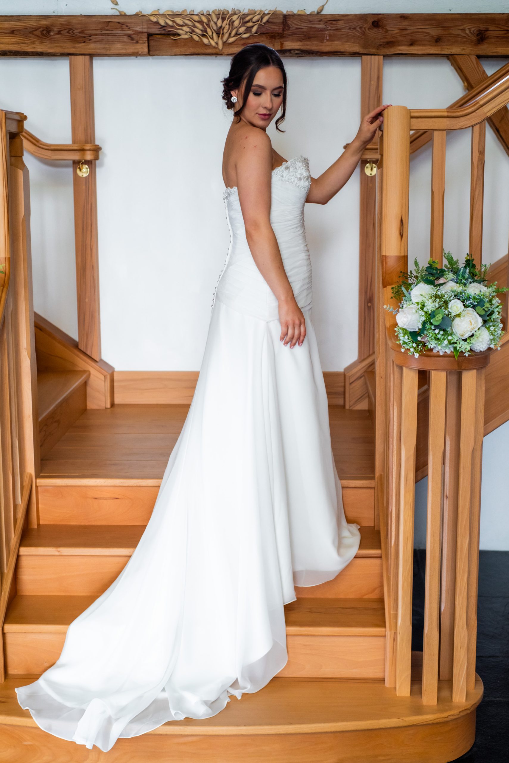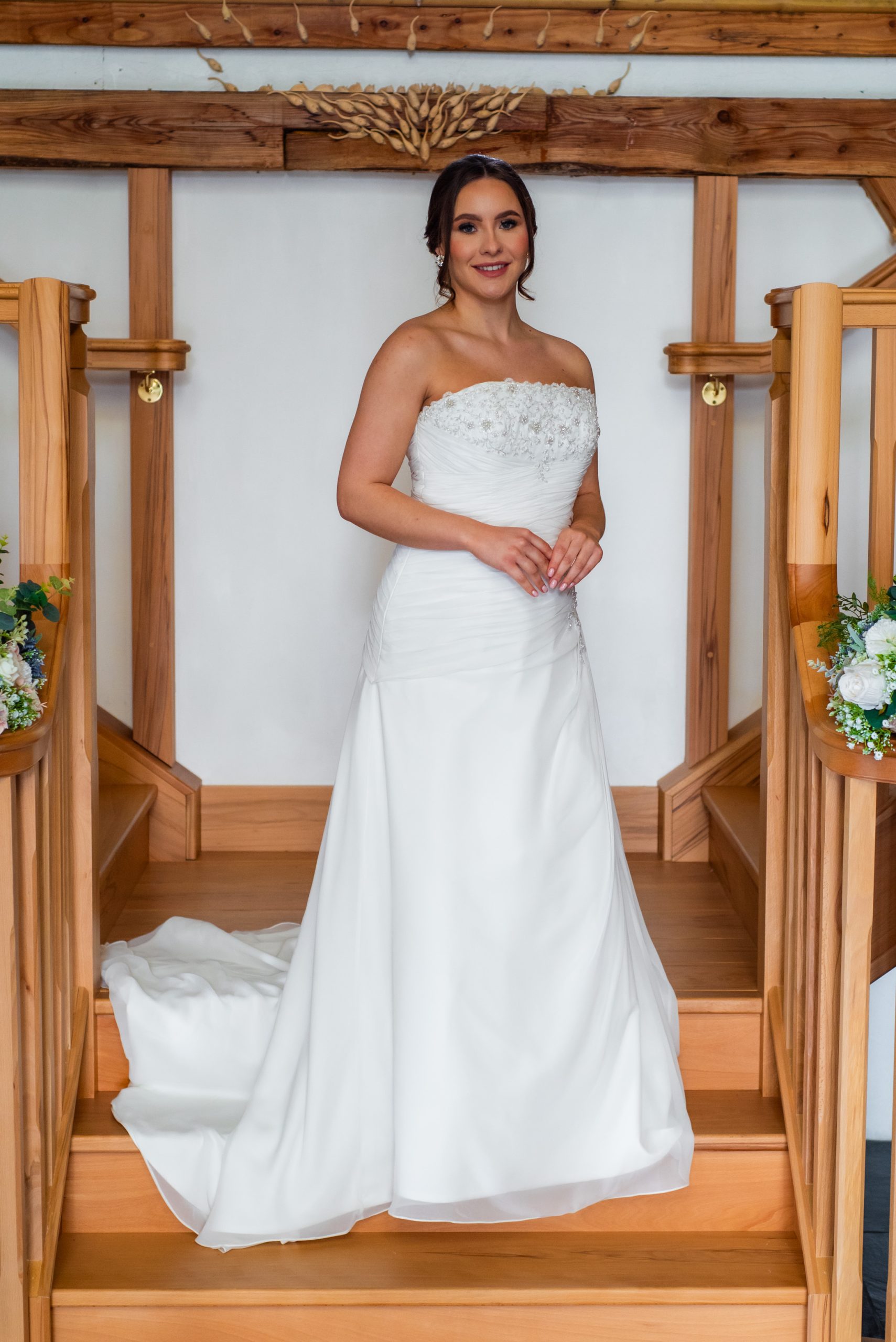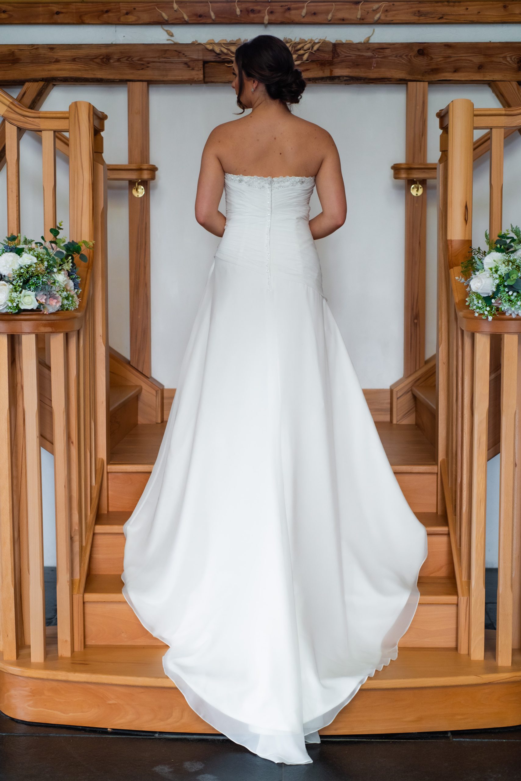 This delicate light ivory satin dress with chiffon overlay is pleated at the bodice to the hips, and is highlighted with amazing beadwork and scalloped lace at the straight neckline, waist, and hip area. The dress has a clean fit and flare shape, is strapless, and has a zip closure decorated with clear buttons at the back giving it that extra touch of elegance. The dress has a court train, Measurements as a guideline are… Bust 92cm (36″), Waist 81cm (32″), Hips 112cm (44″), Length at side seam 140cm (55″) Fabric is Polyester.