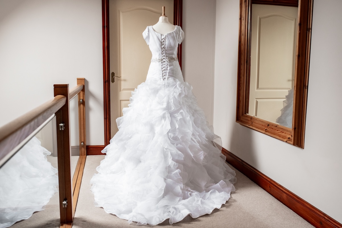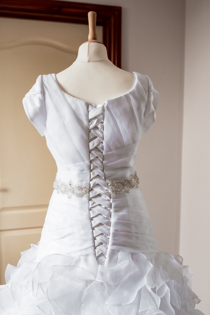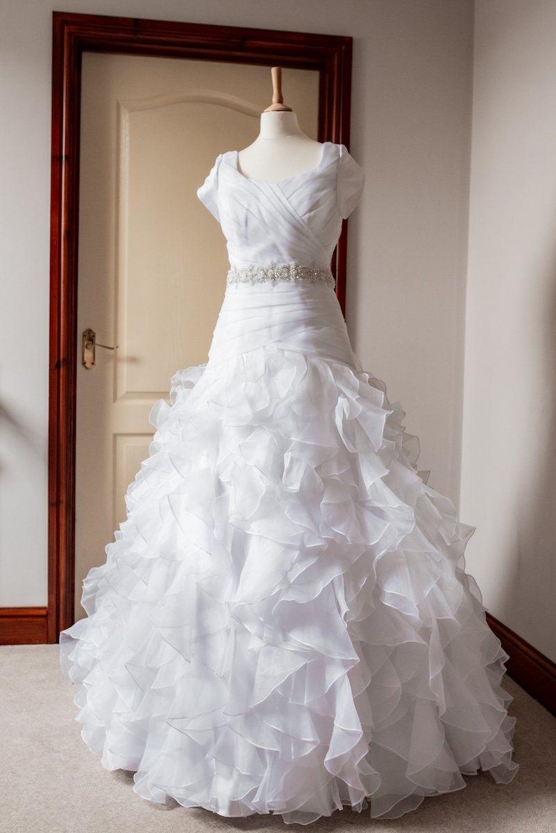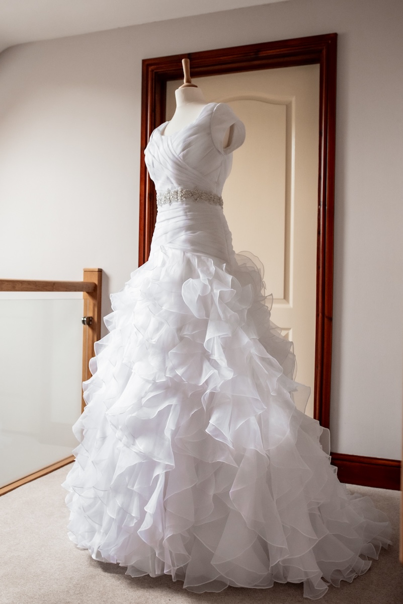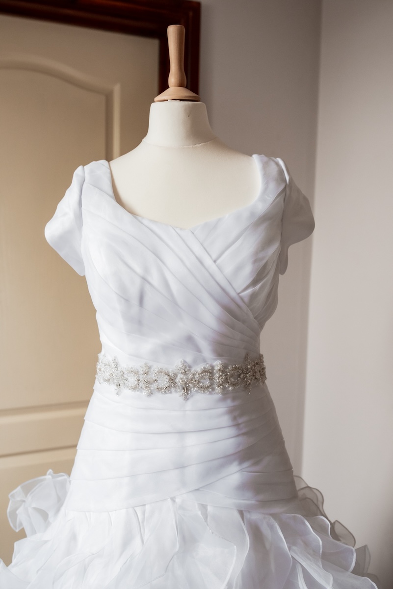 The scoop neckline at the front and back created by the pleated organza fabric runs to the hips before cascading down to a stunning organza frilled skirt and court train.The bodice is finished with small sleeves, lace up back with a an amazing beaded belt. Measurements as a guideline are…. Bust 88cm (34.5″), waist 76cm (30″) Hips 96cm (37.5″), Length at side seam 140cm (55″). Fabric is Polyester