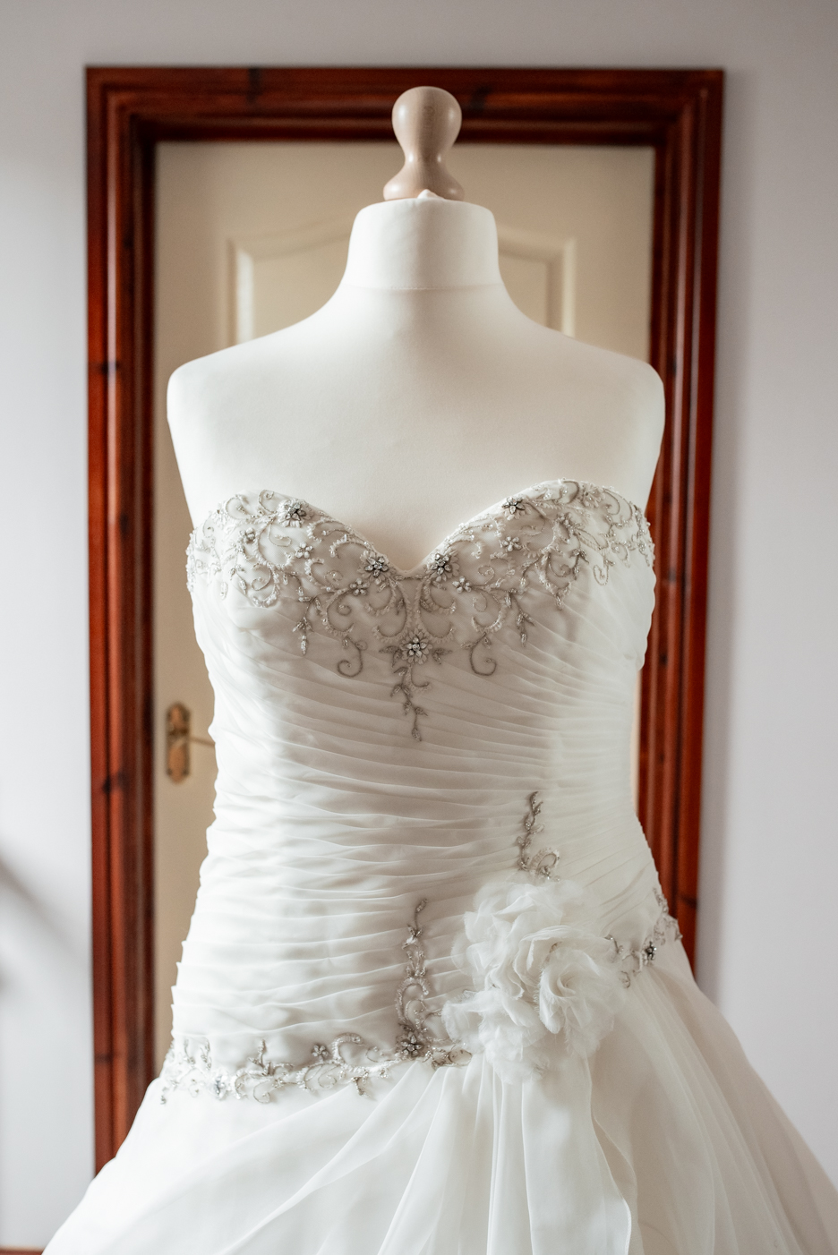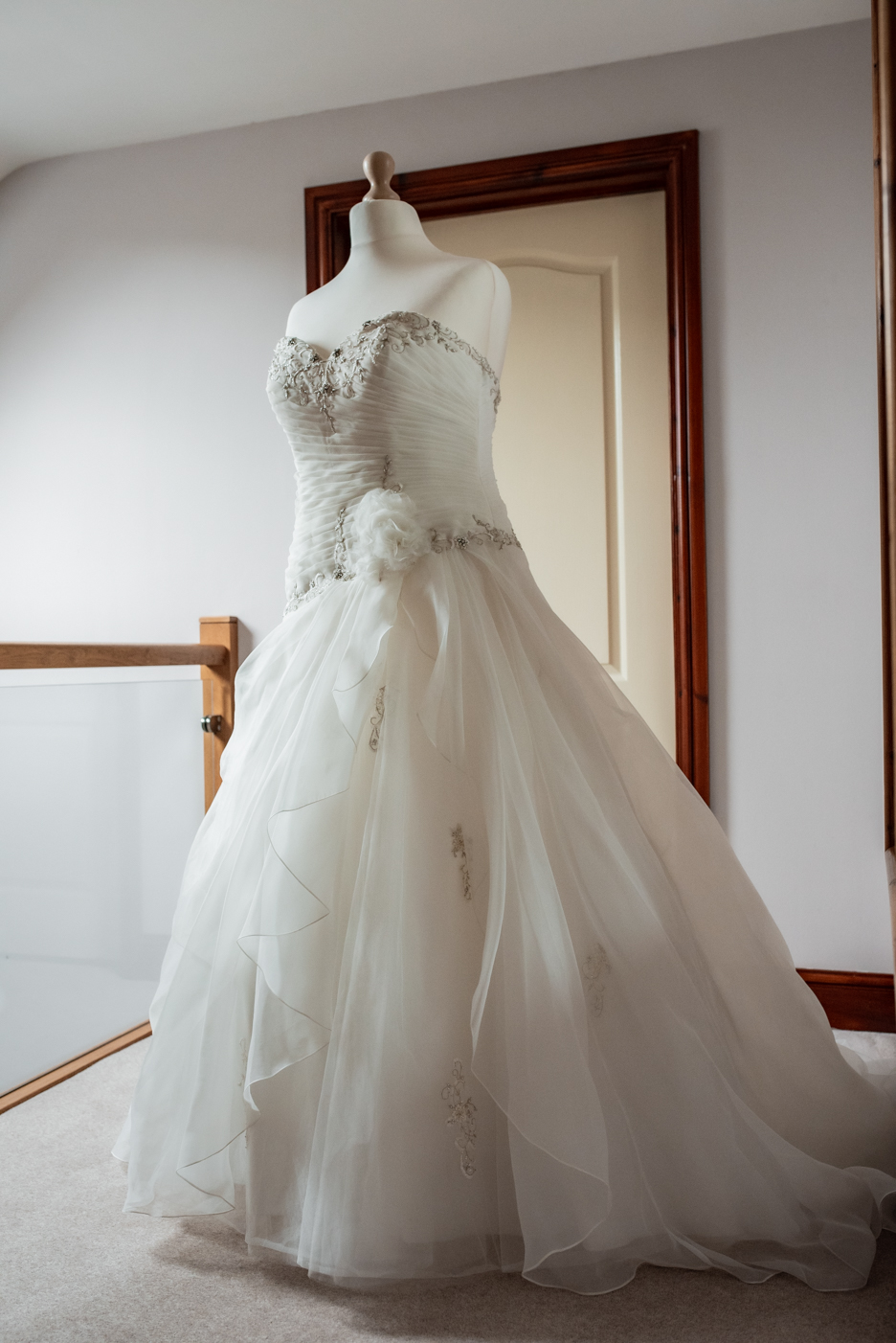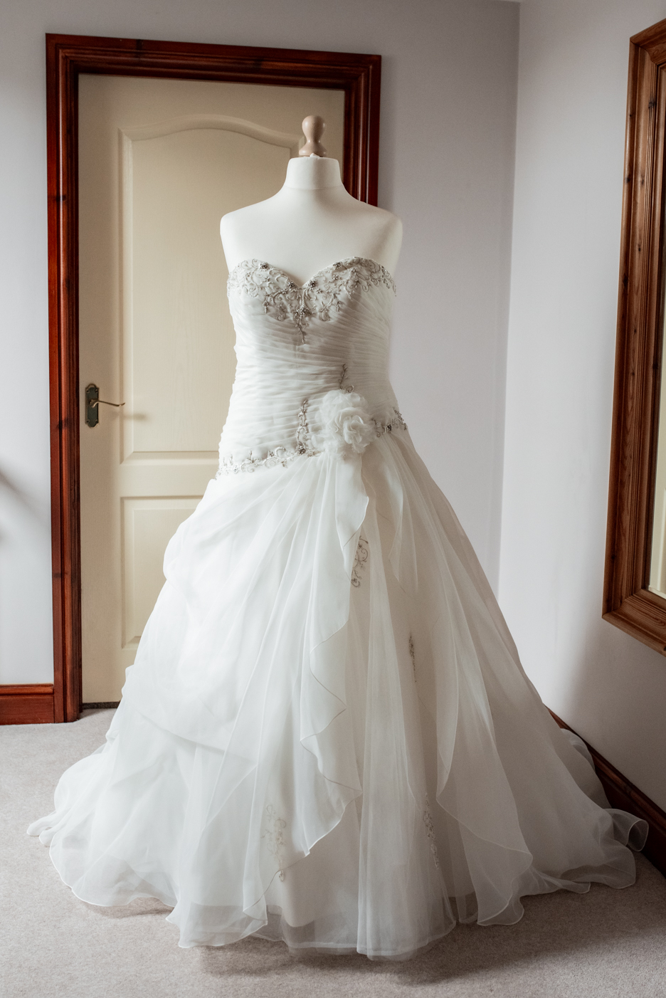A romantic ivory ball gown dress with a classic sweetheart neckline, an asymmetrical bodice and a full layered tulle and organza skirt.