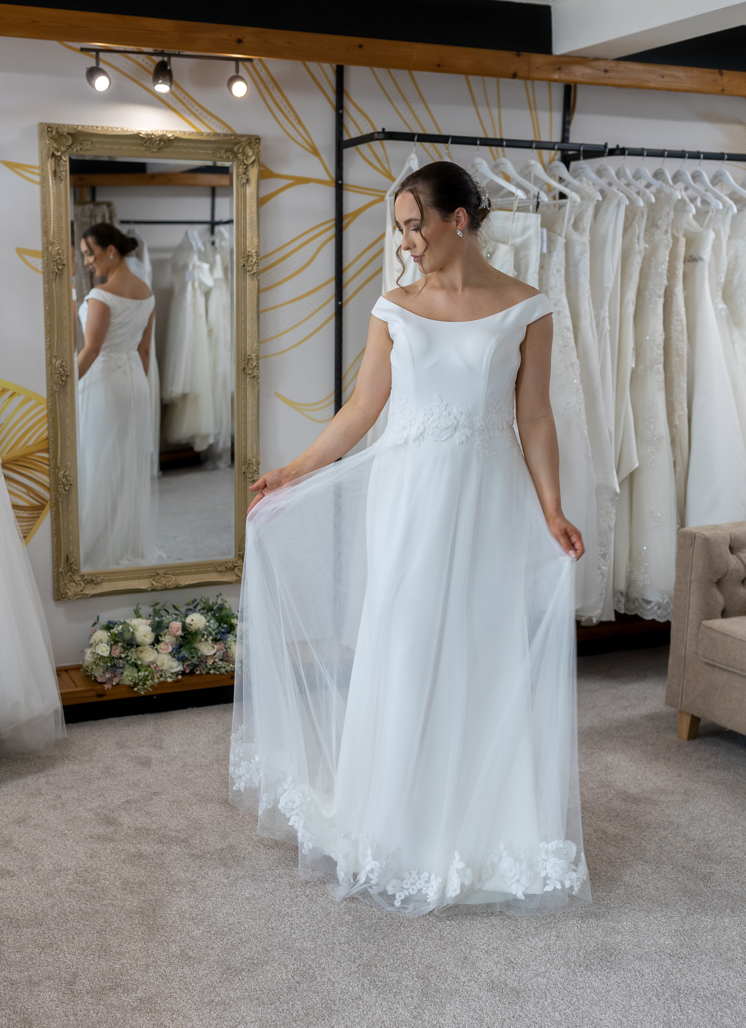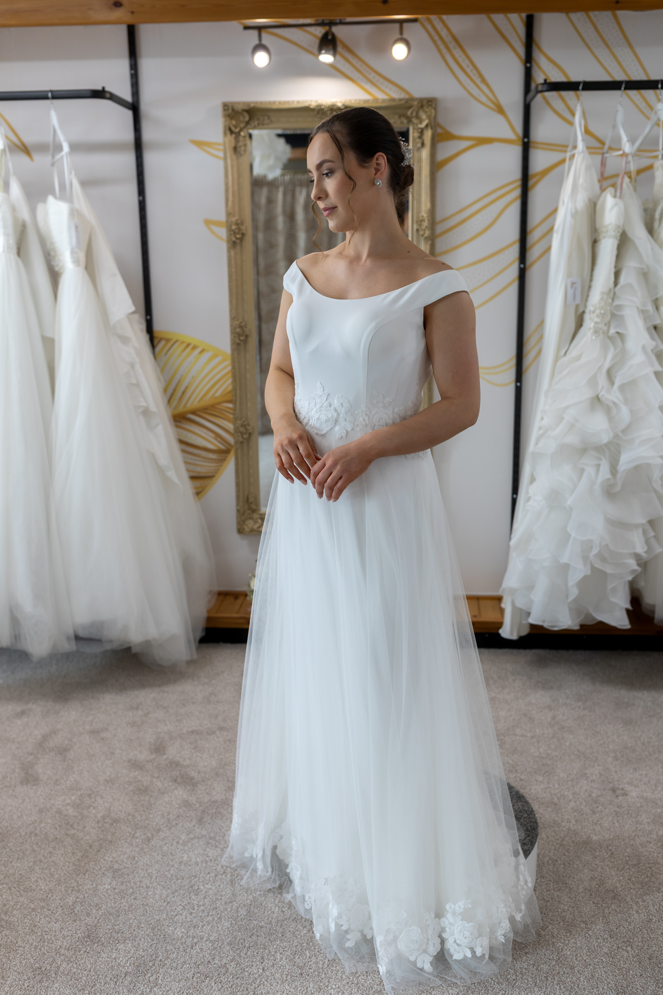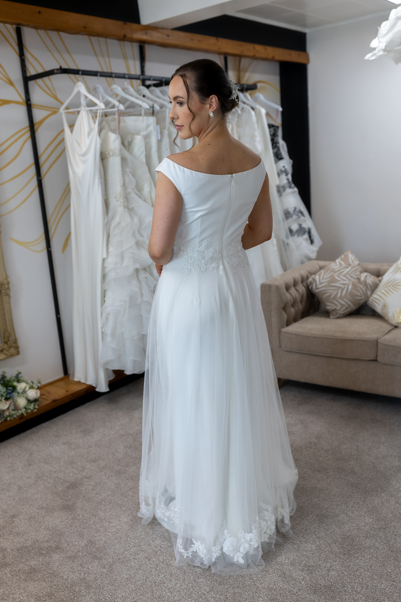 This exquisite A-line dress in crepe fabric features a romantic off-the-shoulder neckline in a scoop shape and a bodice adorned with princess seams. The subtle floral lace embroidery is elegantly incorporated at the waist and hem of the tulle skirt. The dress is secured with a zipper and does not have a train. Measurements as a guide line are Bust 98cm (38.5″), Waist 81cm (32″), Hips 106cm (42″), Length at side seams 140cm (55″)