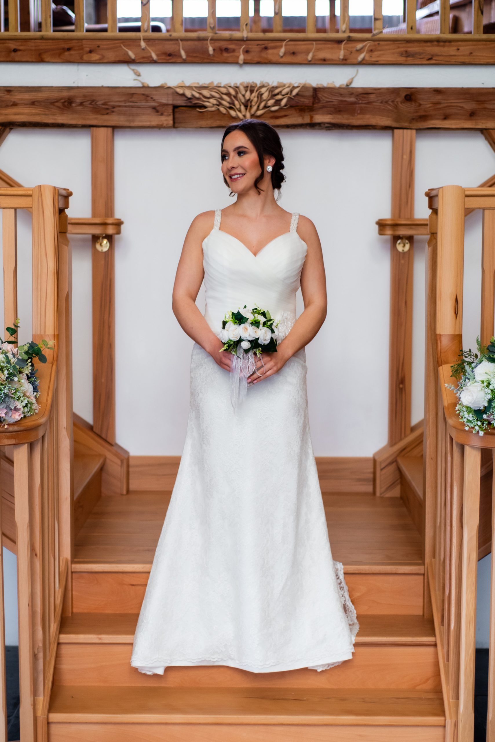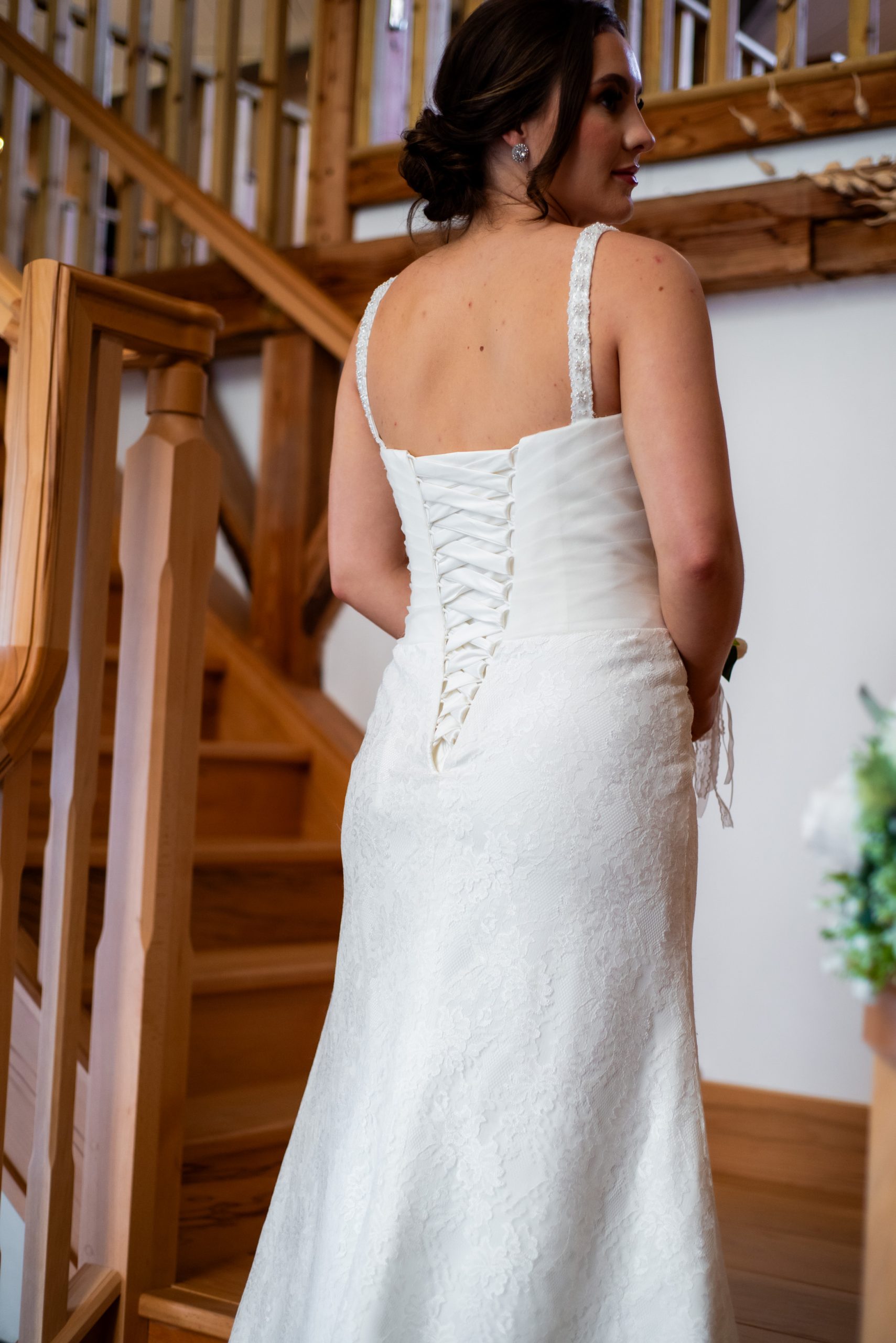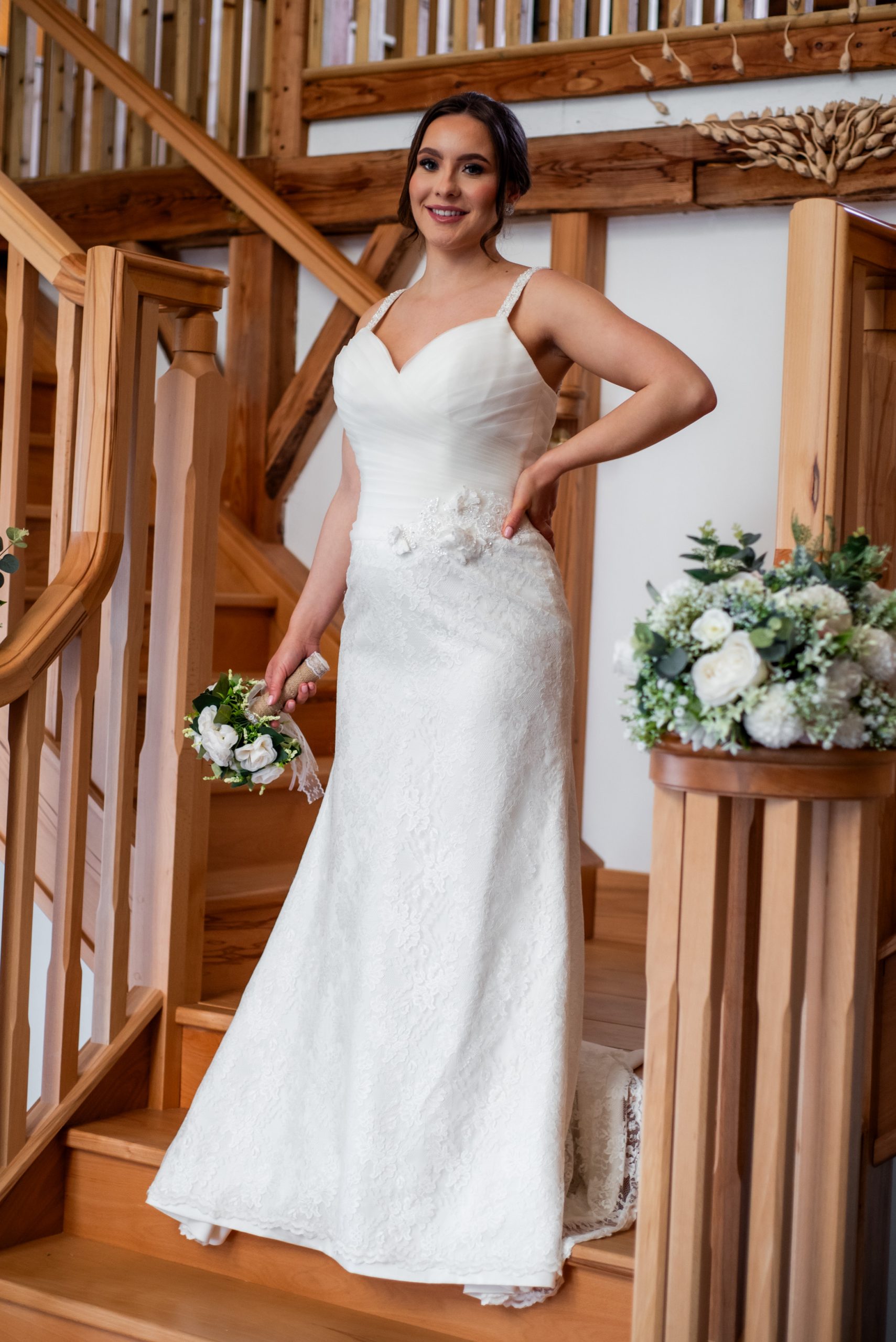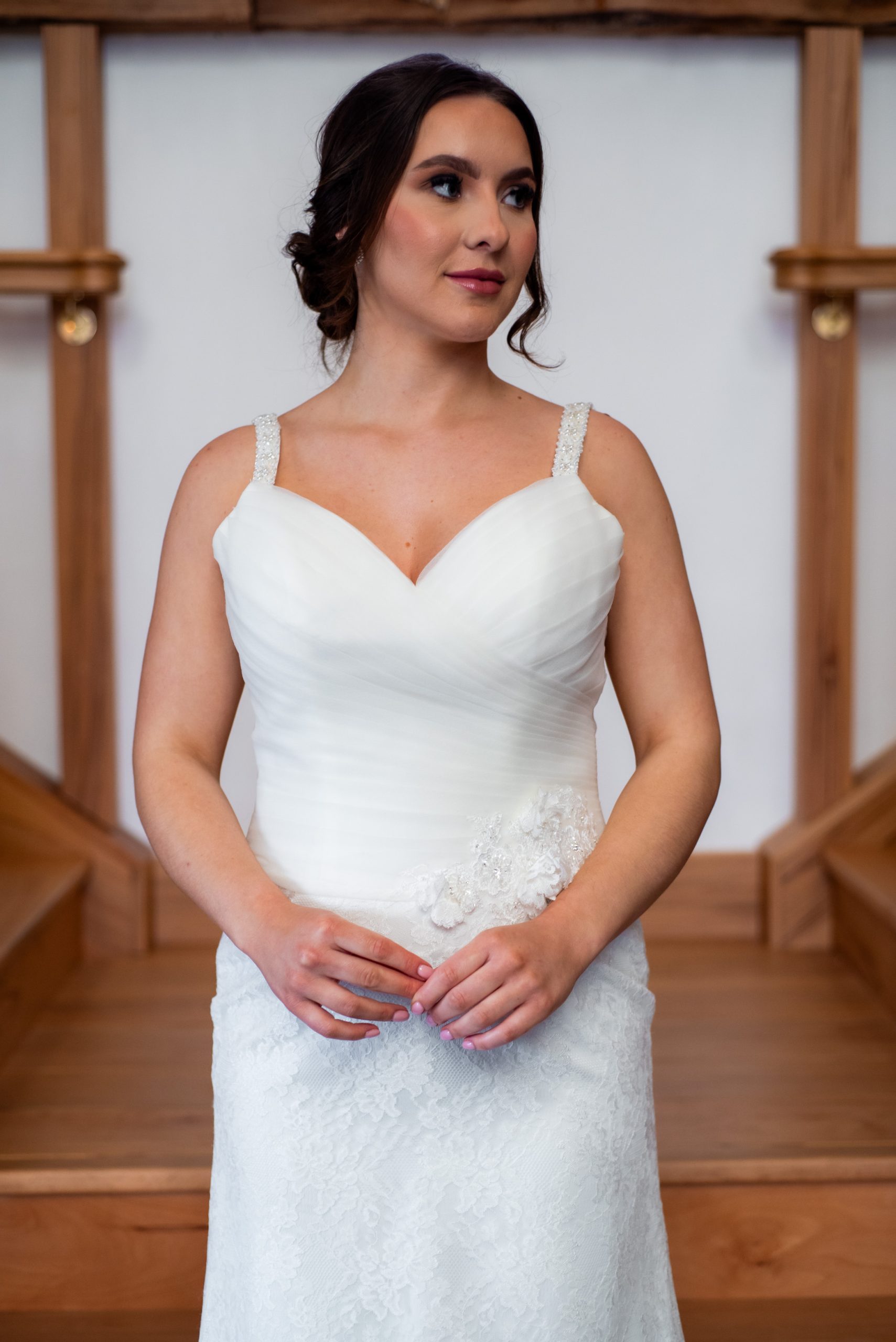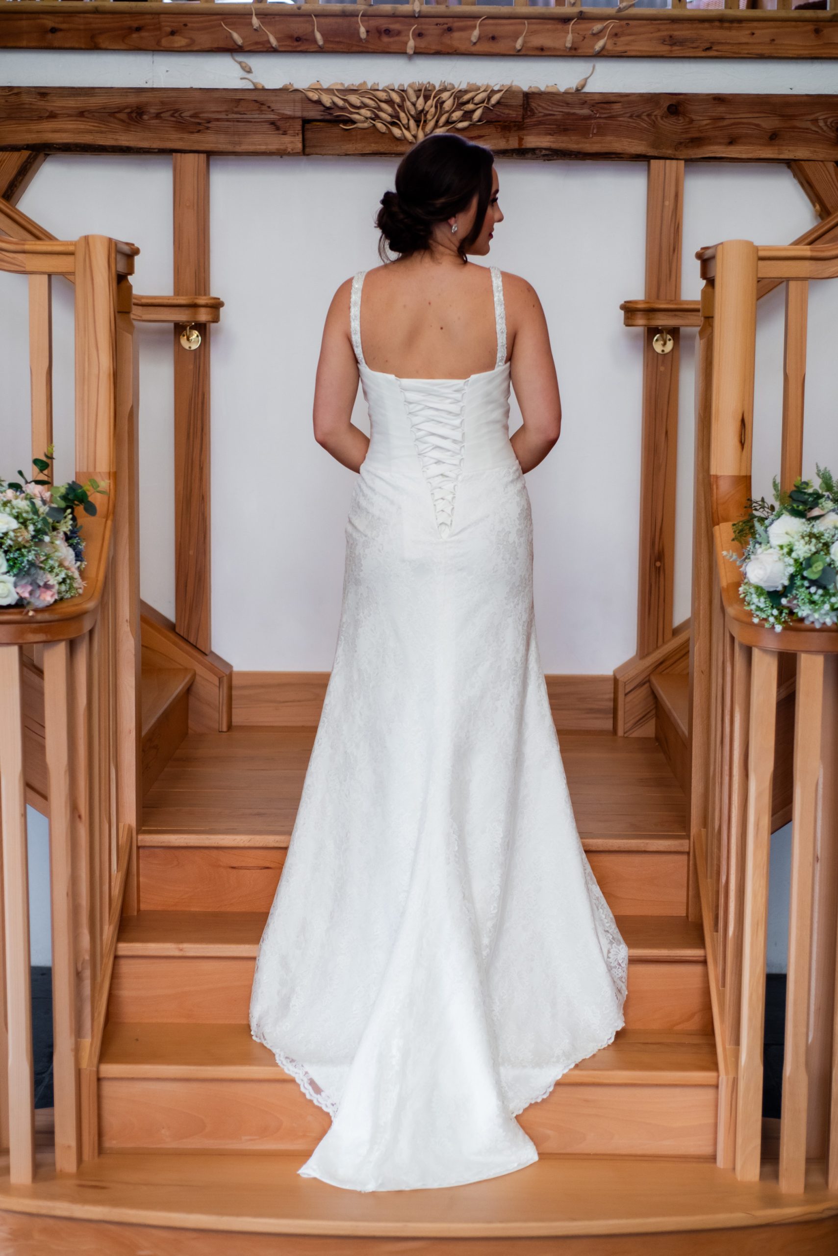 A classic A line dress with a delicate lace skirt that compliments the pleated bodice, with a sweetheart neckline and lace up back. The straps are decorated with beads and a waistline embellishment with flowers, with lace breaks up the silhouette. The dress has a court train. Measurements as guideline are…Bust 94cm (37″). Waist 85cm (33.5″). Hips 105cm (41″)Length at side seam 140cm (55″). Fabric is Polyester.