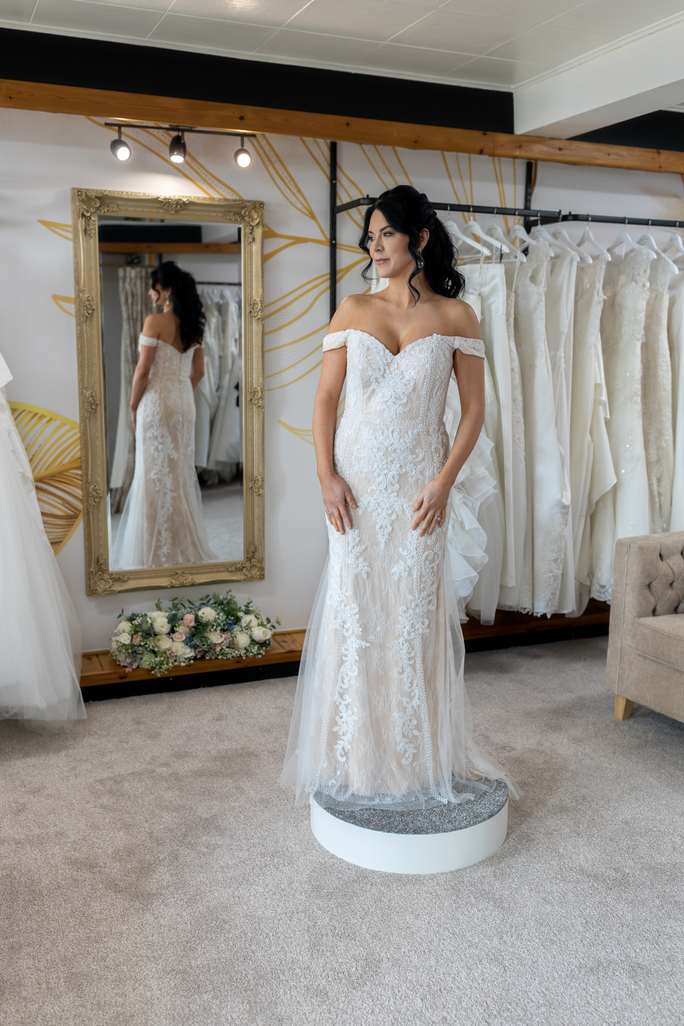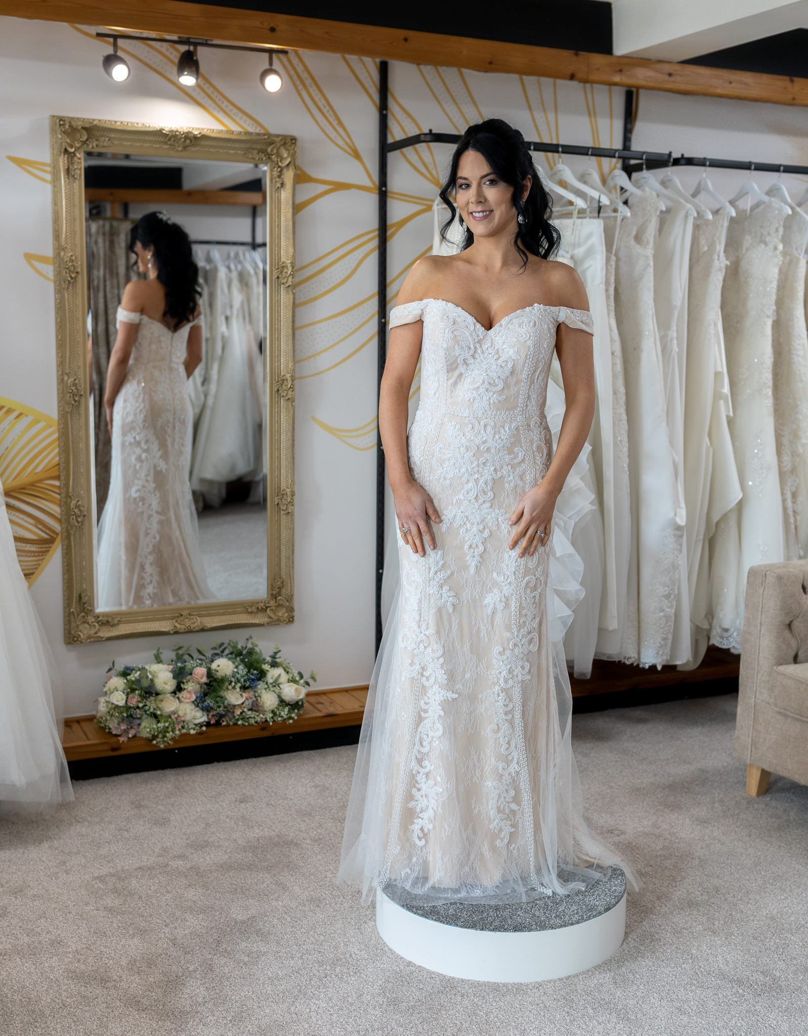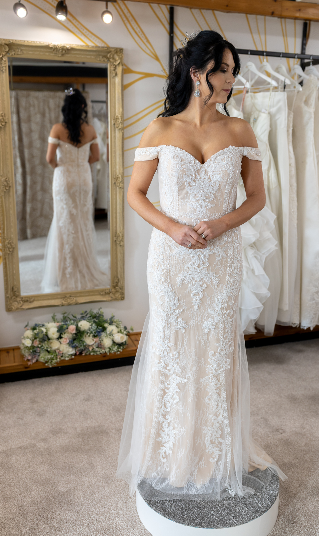 This blush and ivory fit and flare dress boasts off the shoulder straps and a sweetheart neckline. The outer fabric is heavily embellished with beads with stunning flowery effect, but allows the decorative lace below to show through. The decorative. beads also form a waistband around the garment. The dress fits snuggly over the body and flares out at the thighs with the addition of tulle godets to give a lightweight trumpet effect style. The dress is closed via a zip and has no train. Measurements as a guideline are Bust 88cm (34.5″), Waist 78cm (31″), Hip 96cm (38″), Length at side seam 140cm (55″).