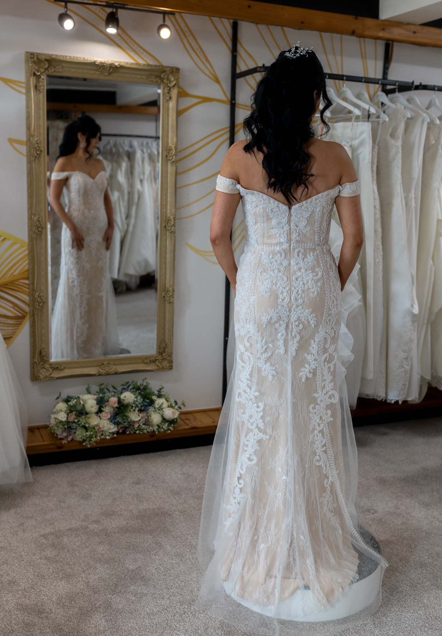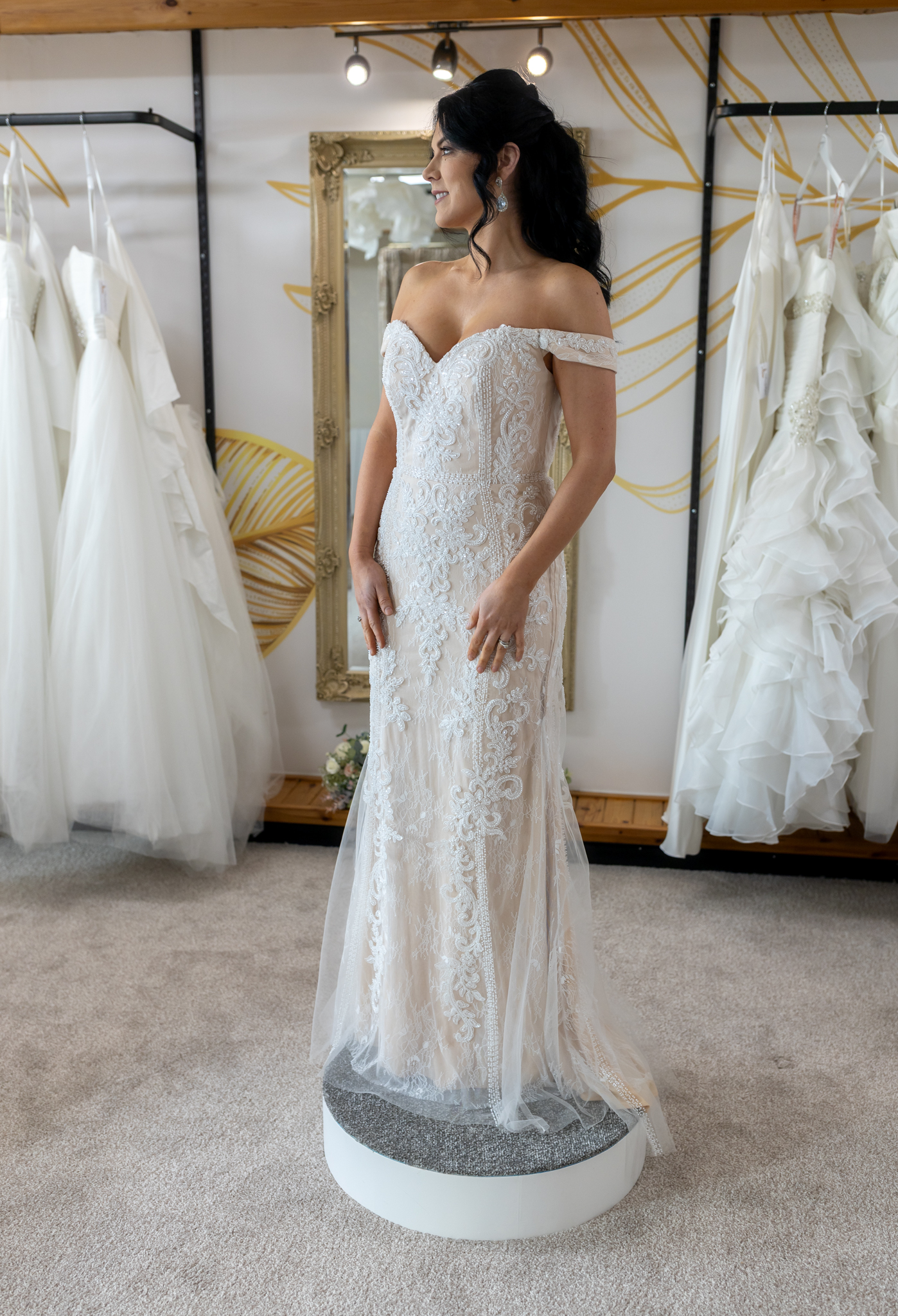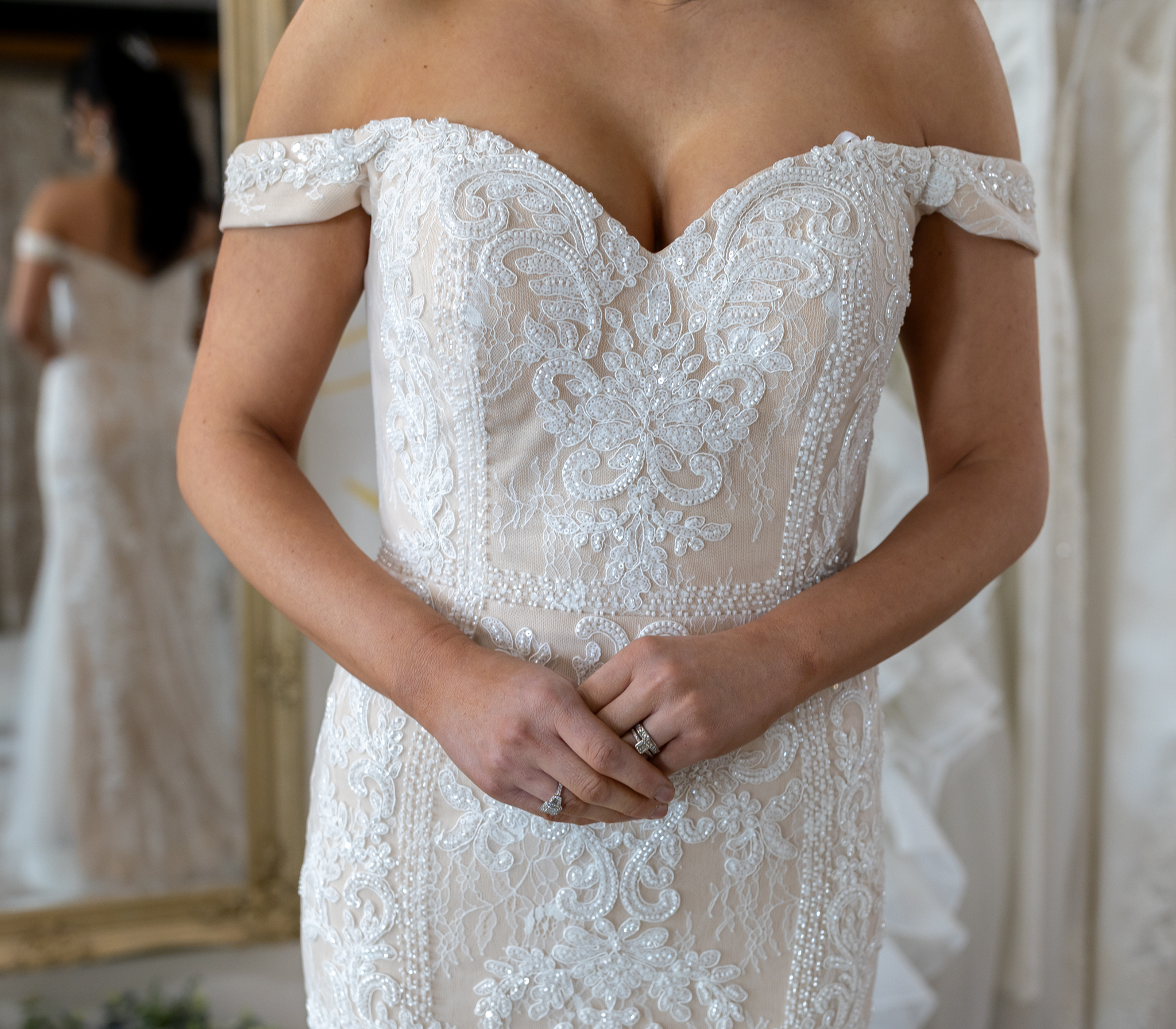 A stunning beade gown in blush with ivory embrodiery and beadwork, and simple but elegant off the shoulder straps.