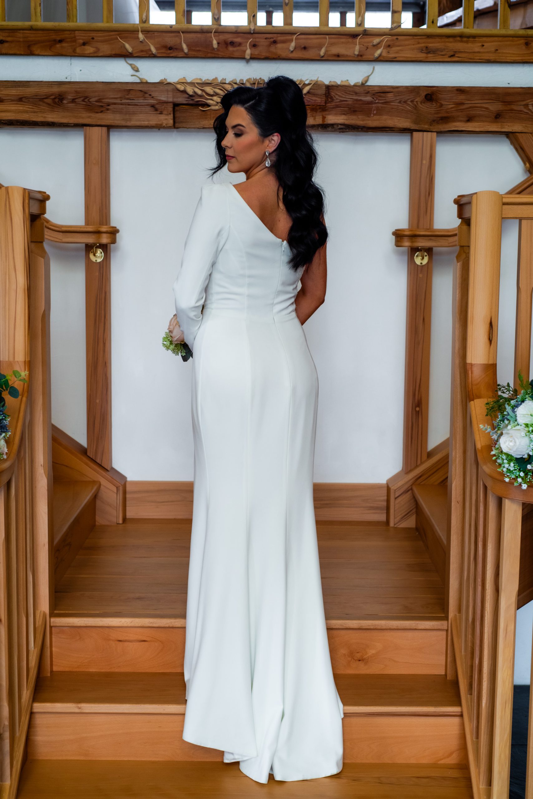 A stunning one shoulder with one long sleeve ivory dress fully lined in a luxurious satin fabric. The lace at the side creates an illusion of a cut out, and is decorated with small pearl beads. The princess seams add a touch of simple elegance and the skirt hugs the hips before gently flowing outward at the hem. There is a split at the front seam to give a modern feel. The dress has a centre back zip and a small sweep train. Measurements as a guideline are… Bust 86cm (33.75″), Waist 71cm (28″), Hips 100cm (39.5″), Length at side seam 139cm (54.5″). Fabric is polyester