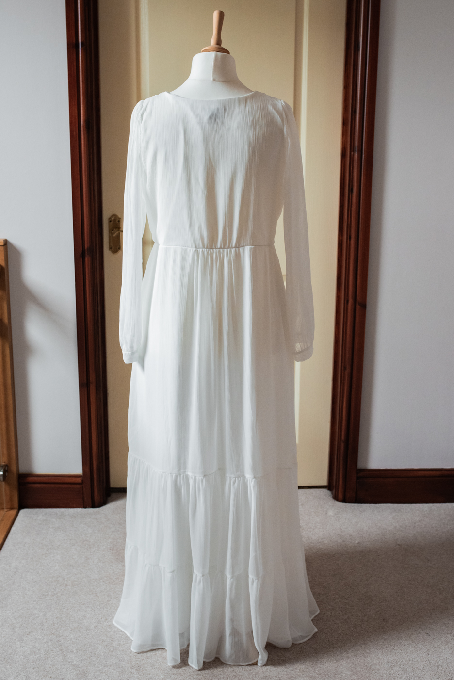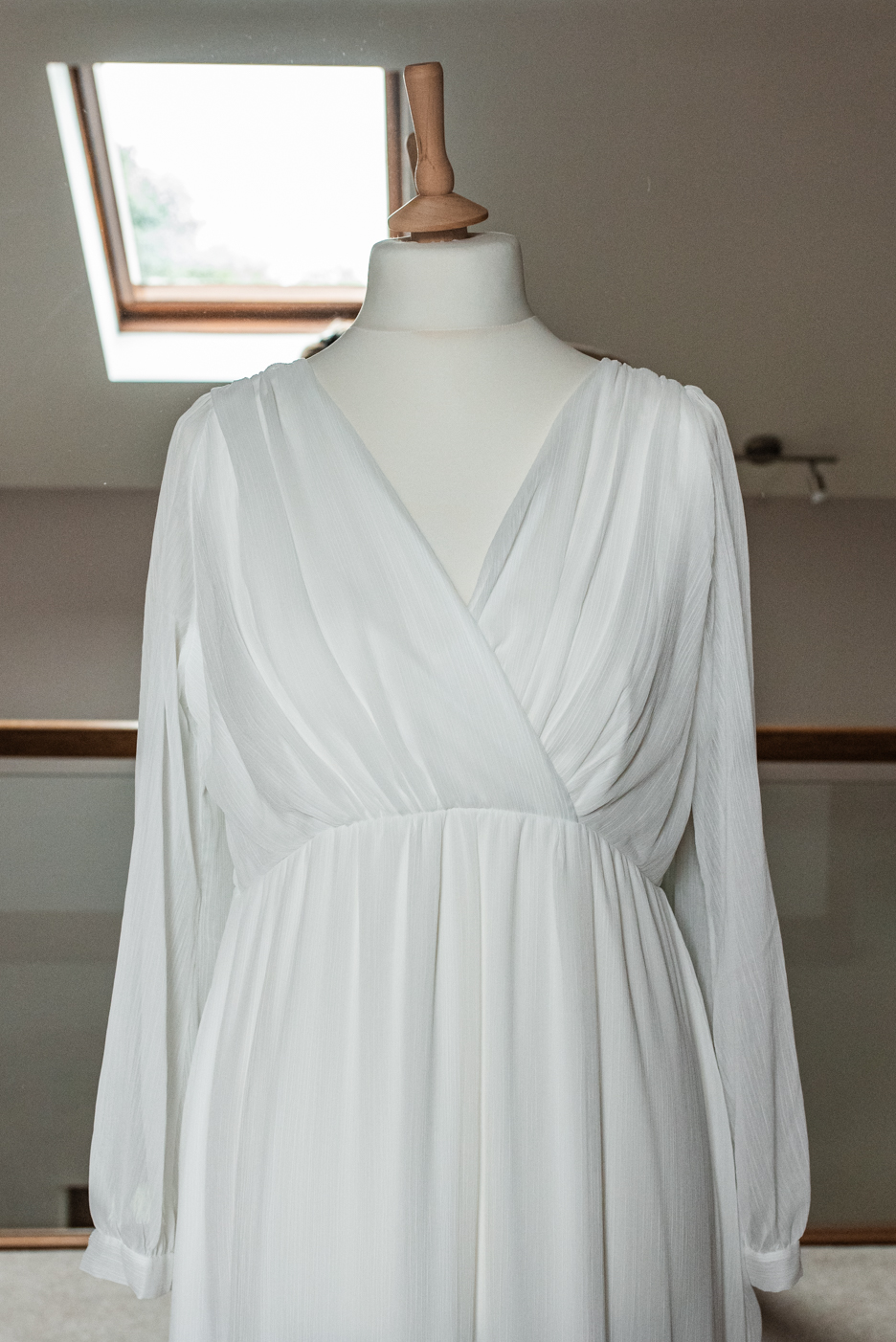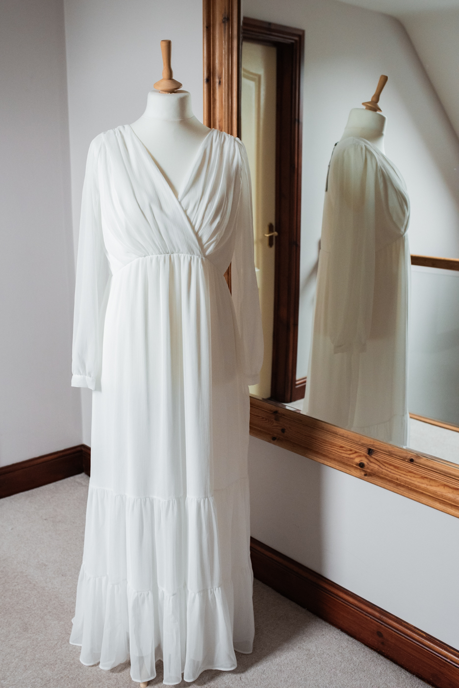 A delicate white chiffon dress with long sleeves and wrap over bodice detail, perfect for pregnance.