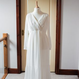 The 3D pearls and beads decorating the straight neckline of this tulle pleated bodice, is complemented by the crystal embellishment on the skirt waist, with the subtle bead work on the skirt tulle. The dress is strapless and is both zip up to the waist, and laced up to the bust.The skirt which consists of layers of soft tulle, organza lining and netting with an overlay of pleated tulle sweeping to the sides. This makes it a full ball gown and princess feel skirt. Measurements as a guideline are…Bust 84cm (33″), Waist 76cm (30″), Hips 133cm (52″), Length at side seam 144cm (56.5″). Fabric is Polyester, Netting is Nylon